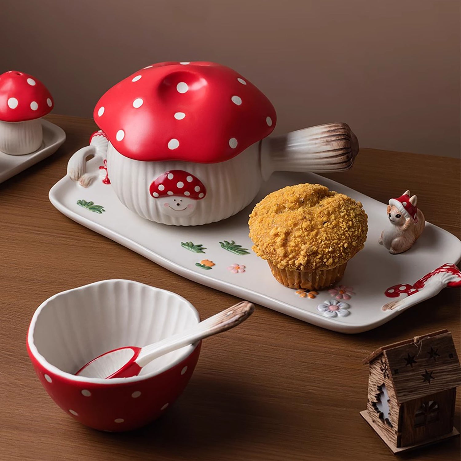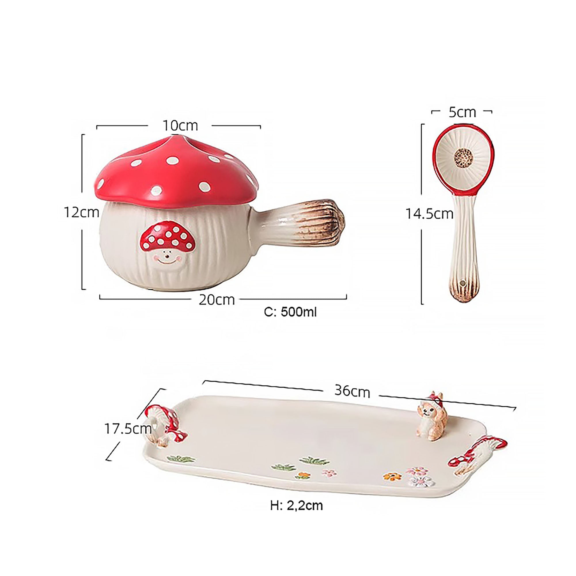 Cette vaisselle de petit-déjeuner, fabriquée à Jingdezhen, arbore une forme de champignon féerique. Conçue par un illustrateur, son design adorable apporte une touche de magie et de douceur à votre table du matin. Cuite à haute température, elle est durable et idéale pour les fêtes de Noël, que ce soit pour soi-même ou comme cadeau plein de charme.