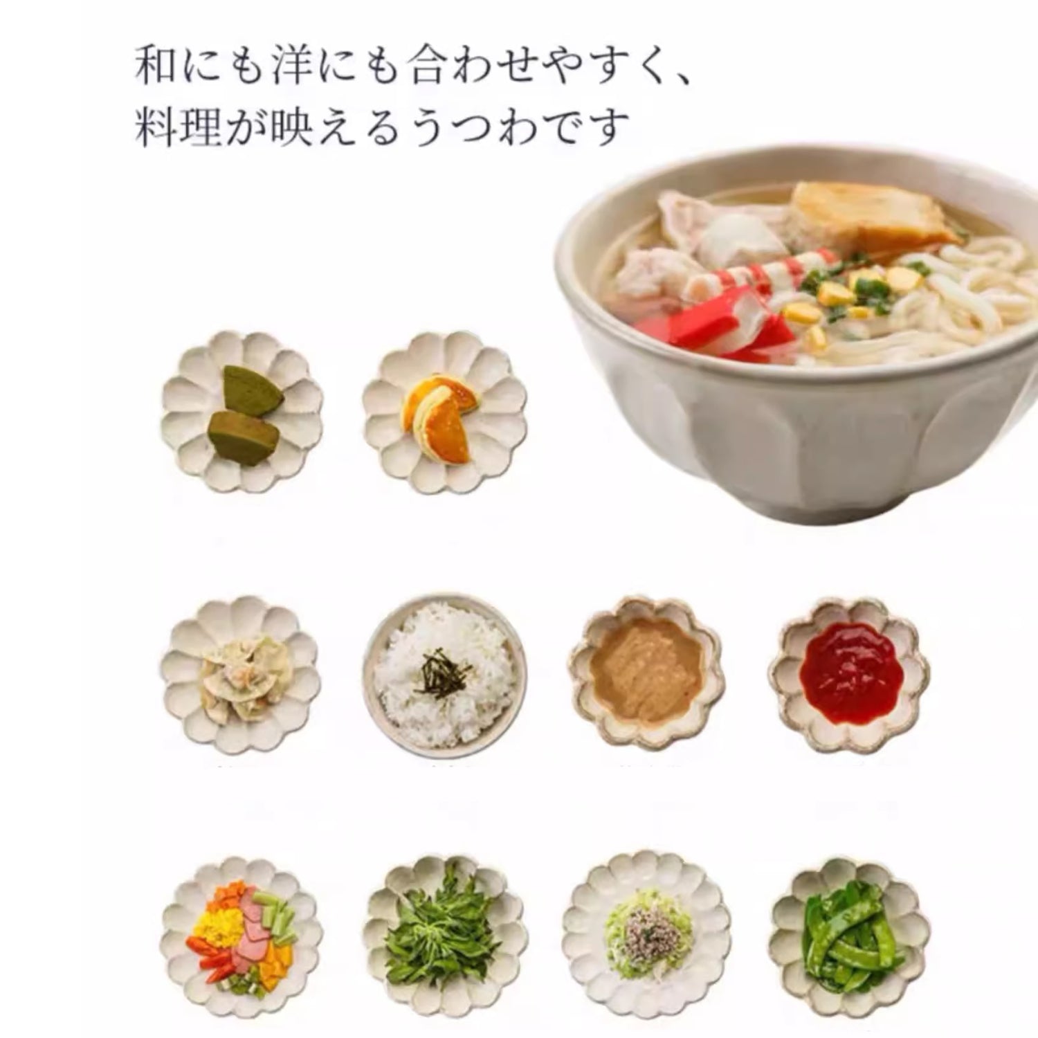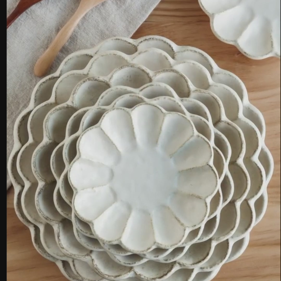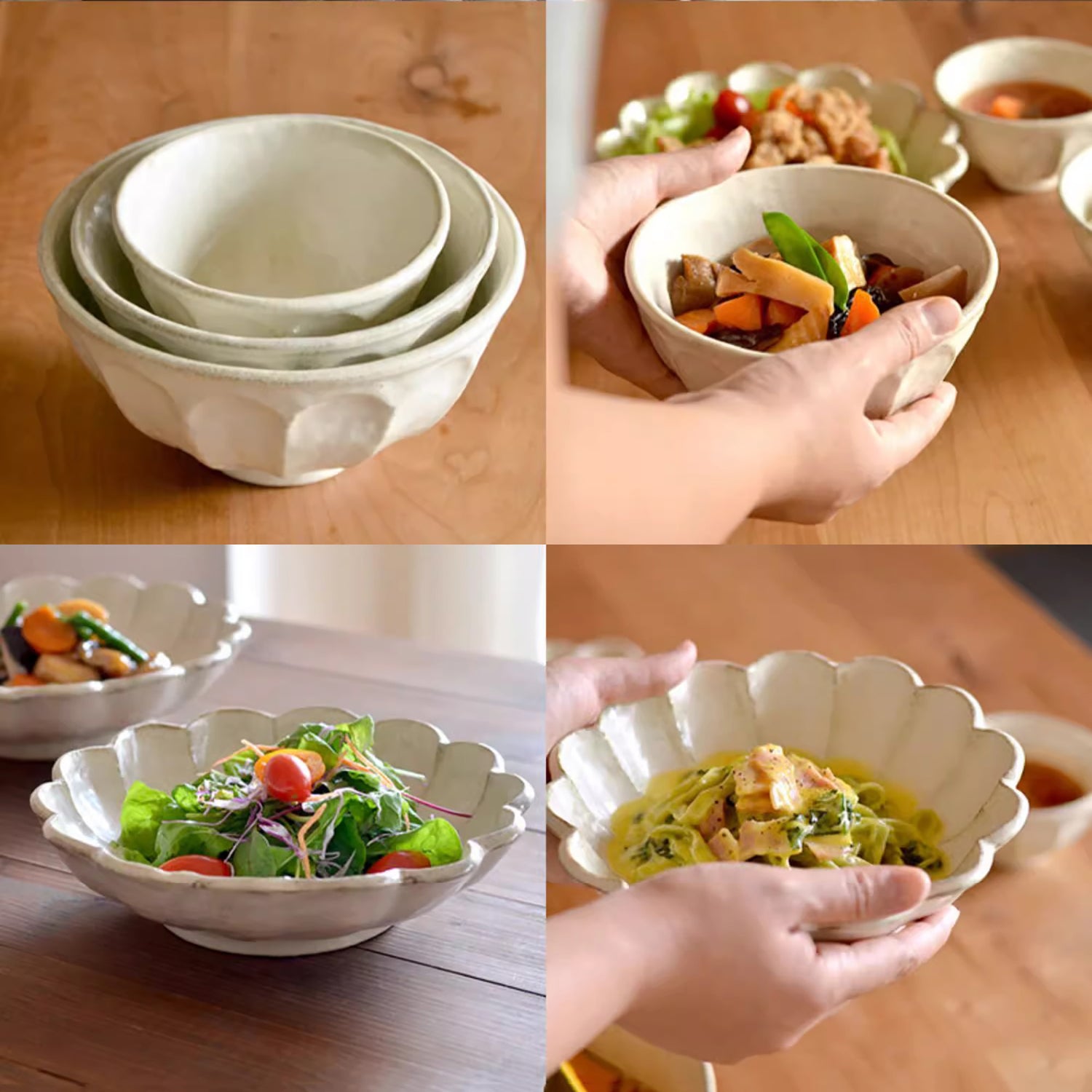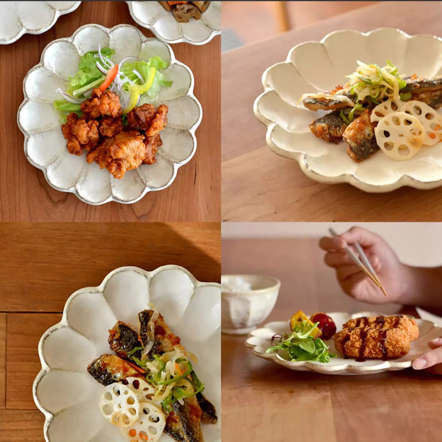 Ce service de table en céramique, créé par l'atelier Rinka Seito dans la région de Mino au Japon, comprend une variété d'assiettes et de bols de différentes tailles pour répondre aux besoins quotidiens. Le design minimaliste en forme de pétales de fleur de poirier, signature de l'atelier, est associé à des textures vieillies faites à la main, reflétant une beauté douce et sobre. Chaque pièce, cuite à haute température sous émail, allie praticité et durabilité, tout en apportant une touche romantique du style japonais à votre table. Idéal pour un usage quotidien ou des occasions spéciales, cet ensemble transforme chaque repas en une expérience japonaise authentique et élégante.