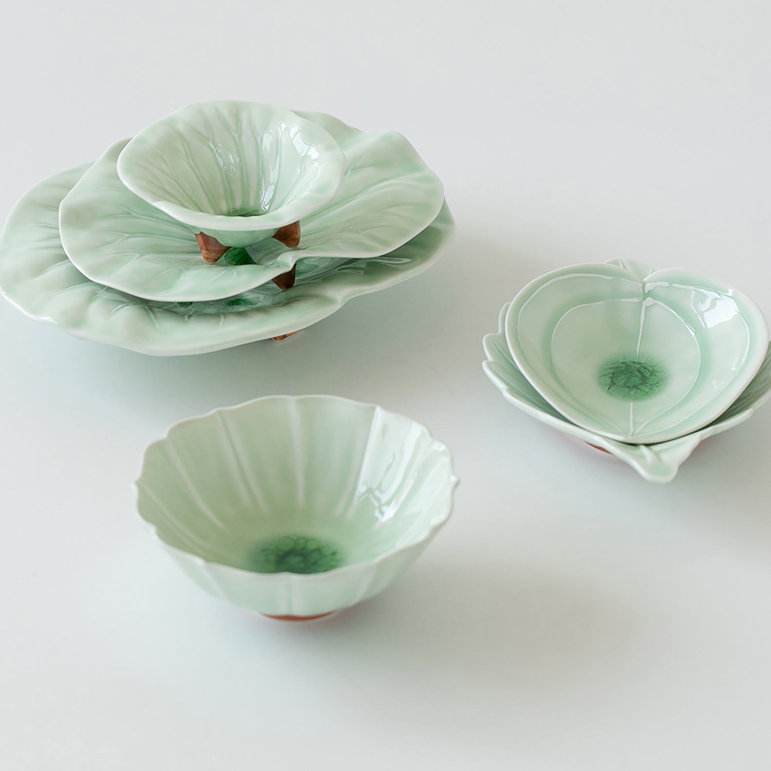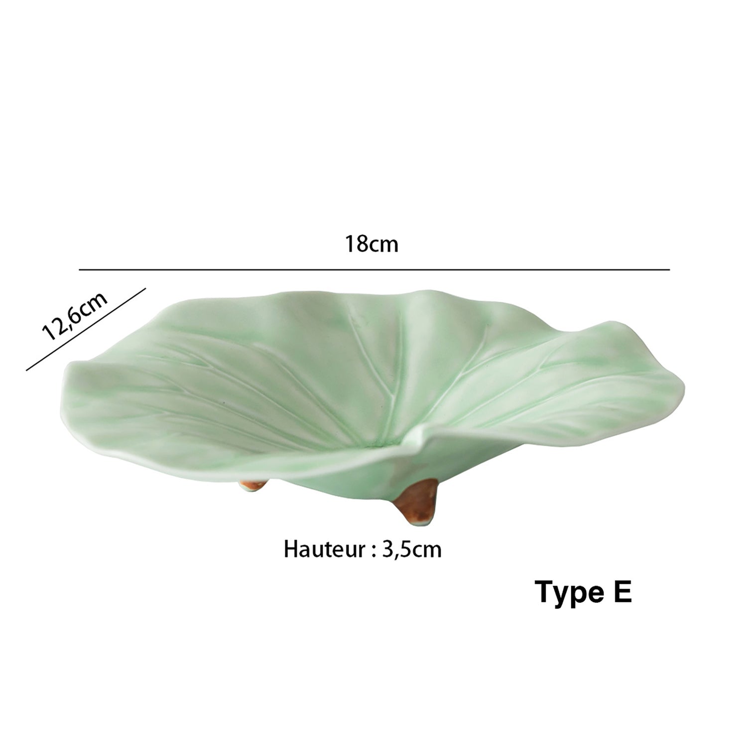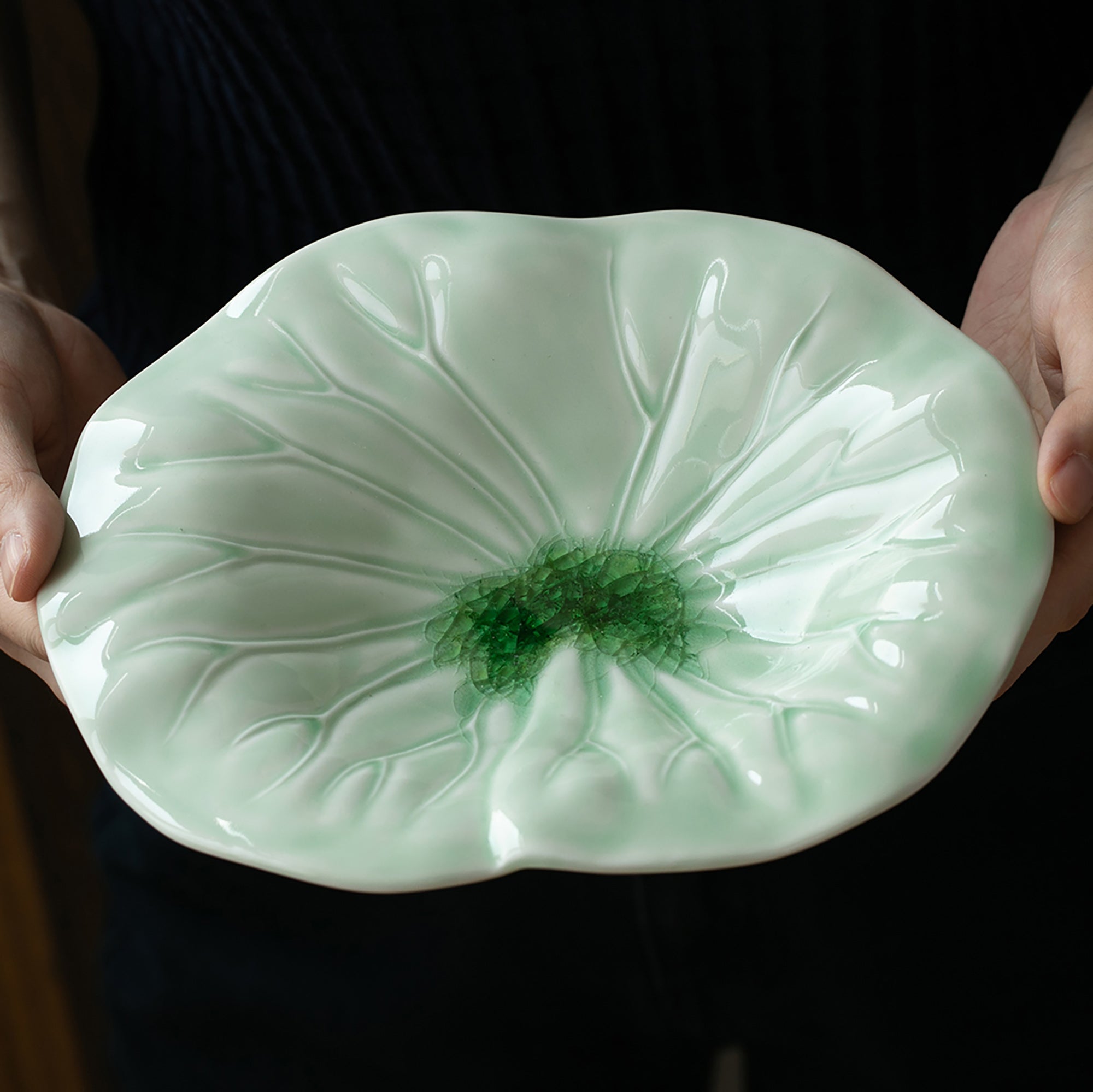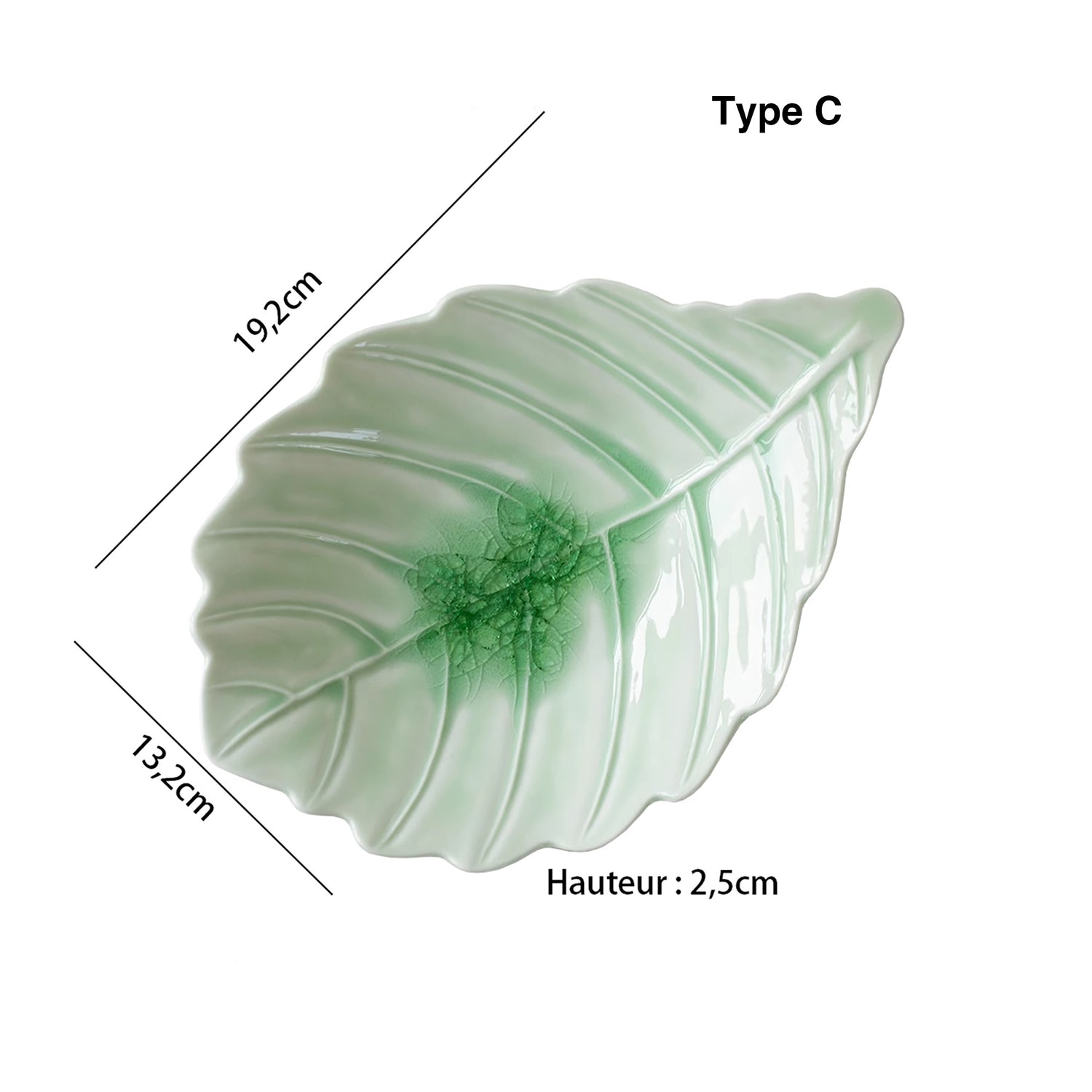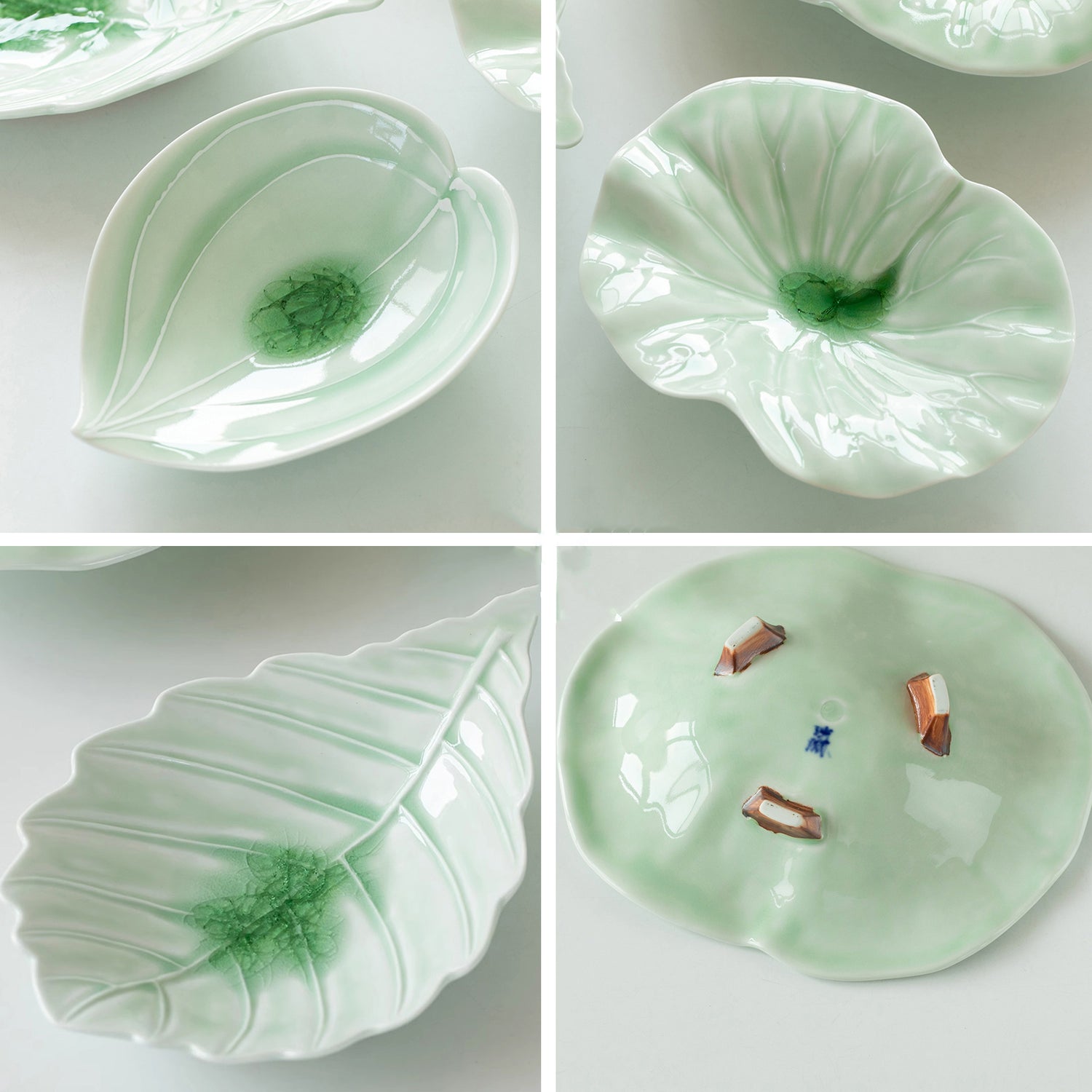 Cette céramique de Bosaïken au Japon ressemble à un trésor naturel, avec sa forme unique de feuilles vertes et son émaillage fissuré au fond de la plaque, créant une beauté vivante et distinctive. Les bords irréguliers semblent être des œuvres d'art créées avec ingéniosité, rendant chaque pièce unique.