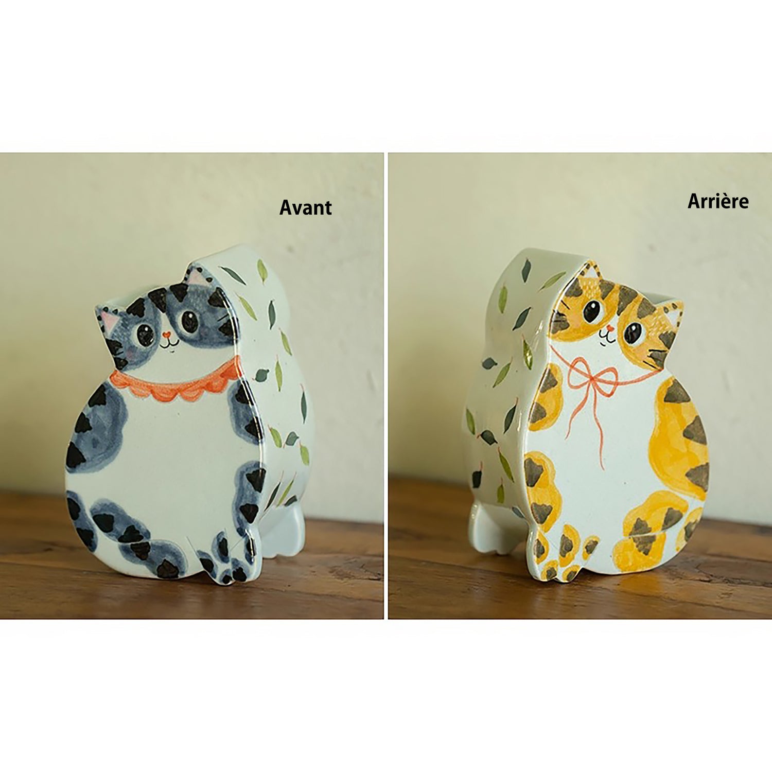 Vase en céramique de Jingdezhen, façonné en forme de chat et peint à la main. Son design attachant présente deux faces différentes, chacune avec son charme unique. Idéal pour accueillir des fleurs fraîches ou séchées, il combine utilité et décoration chaleureuse, parfait pour embellir votre intérieur ou offrir en cadeau.