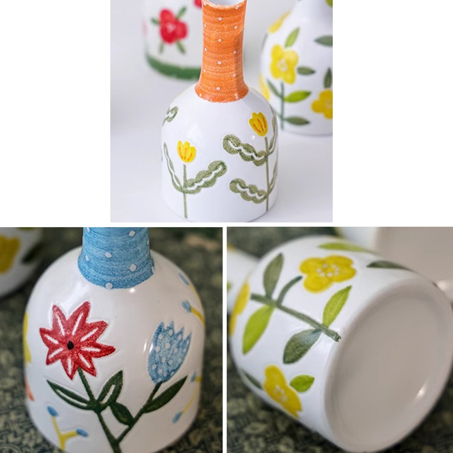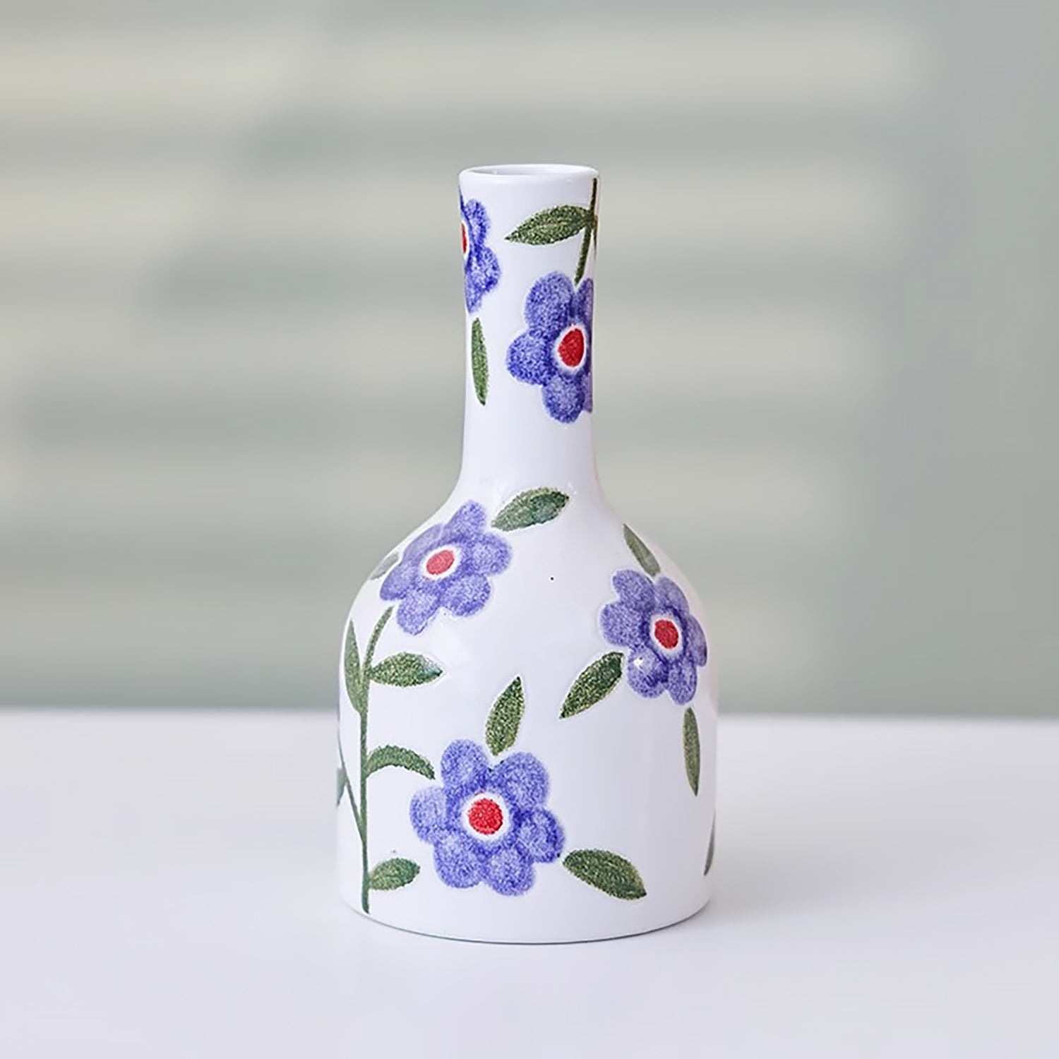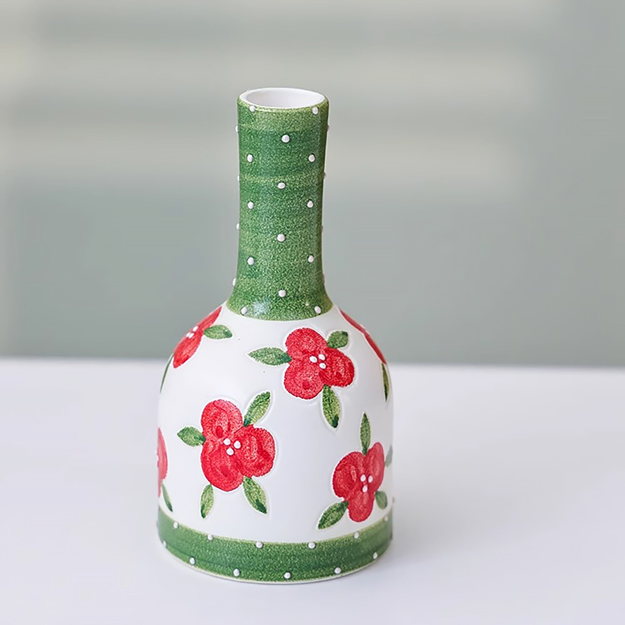 Petit vase en céramique fabriqué à la main à Jingdezhen, avec des courbes douces et élégantes. Réalisé en émail sans plomb à haute température, et orné de motifs floraux peints à la main. Idéal comme vase décoratif ou petit objet artistique pour le salon ou le bureau.