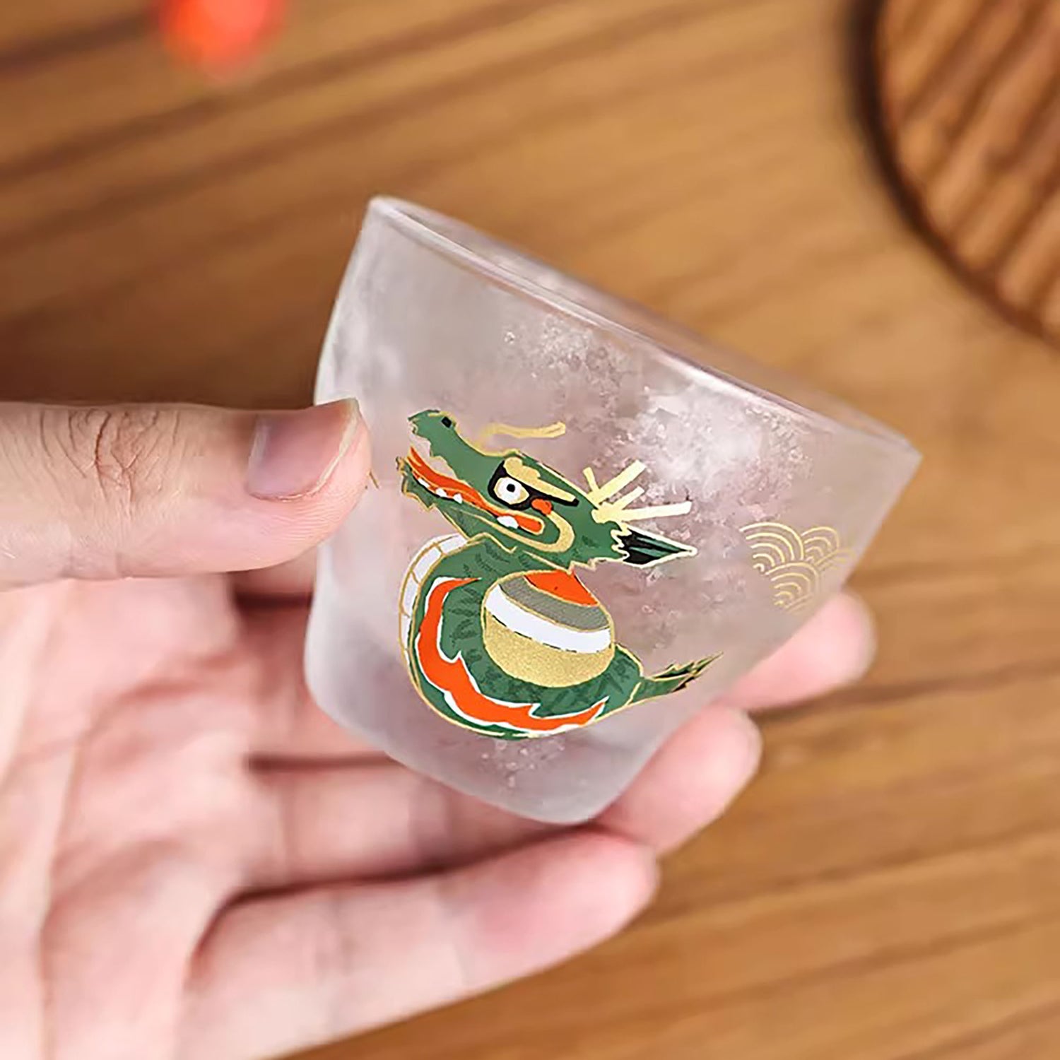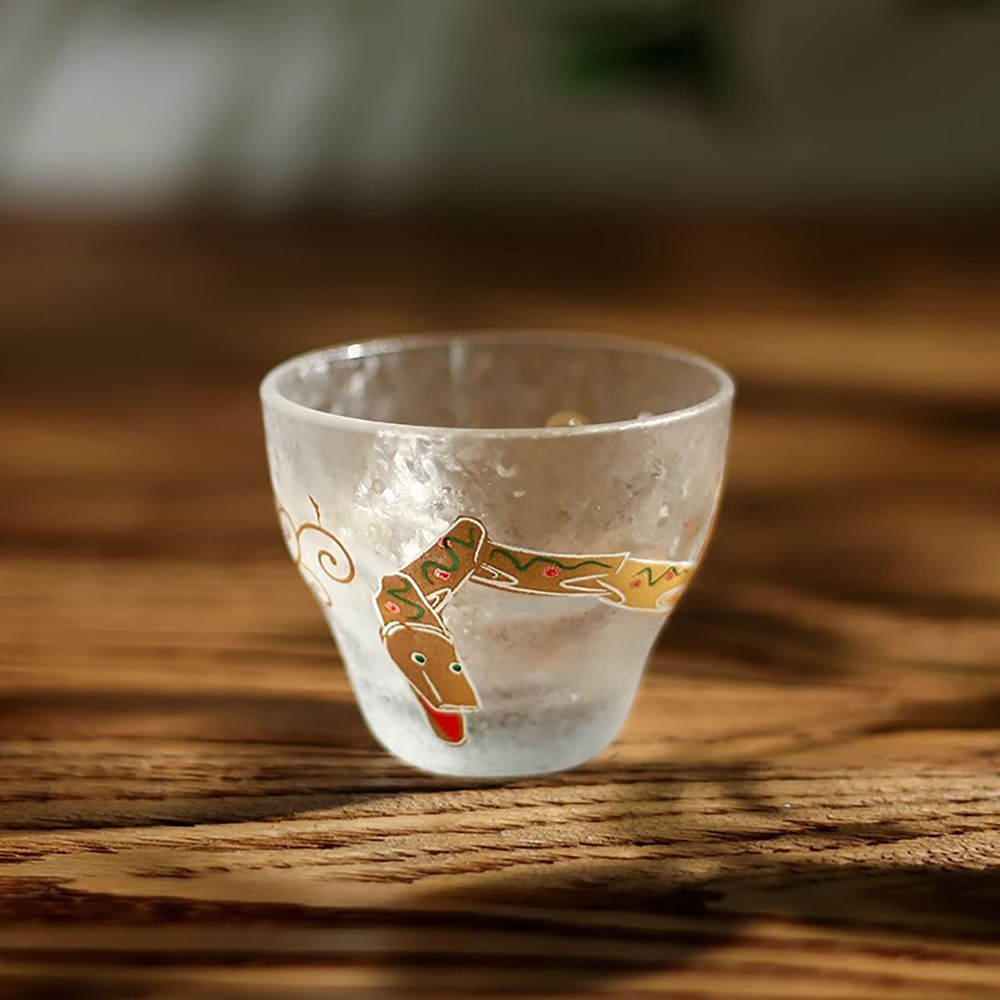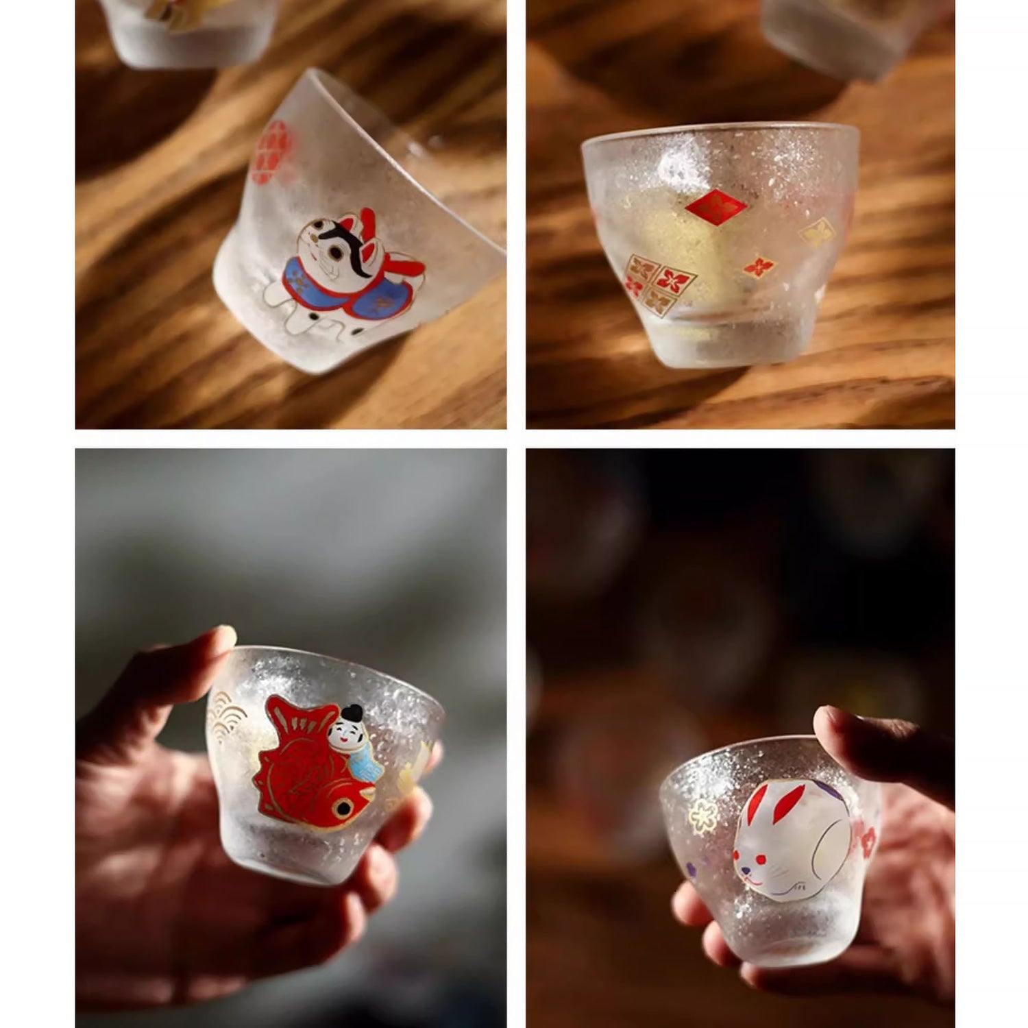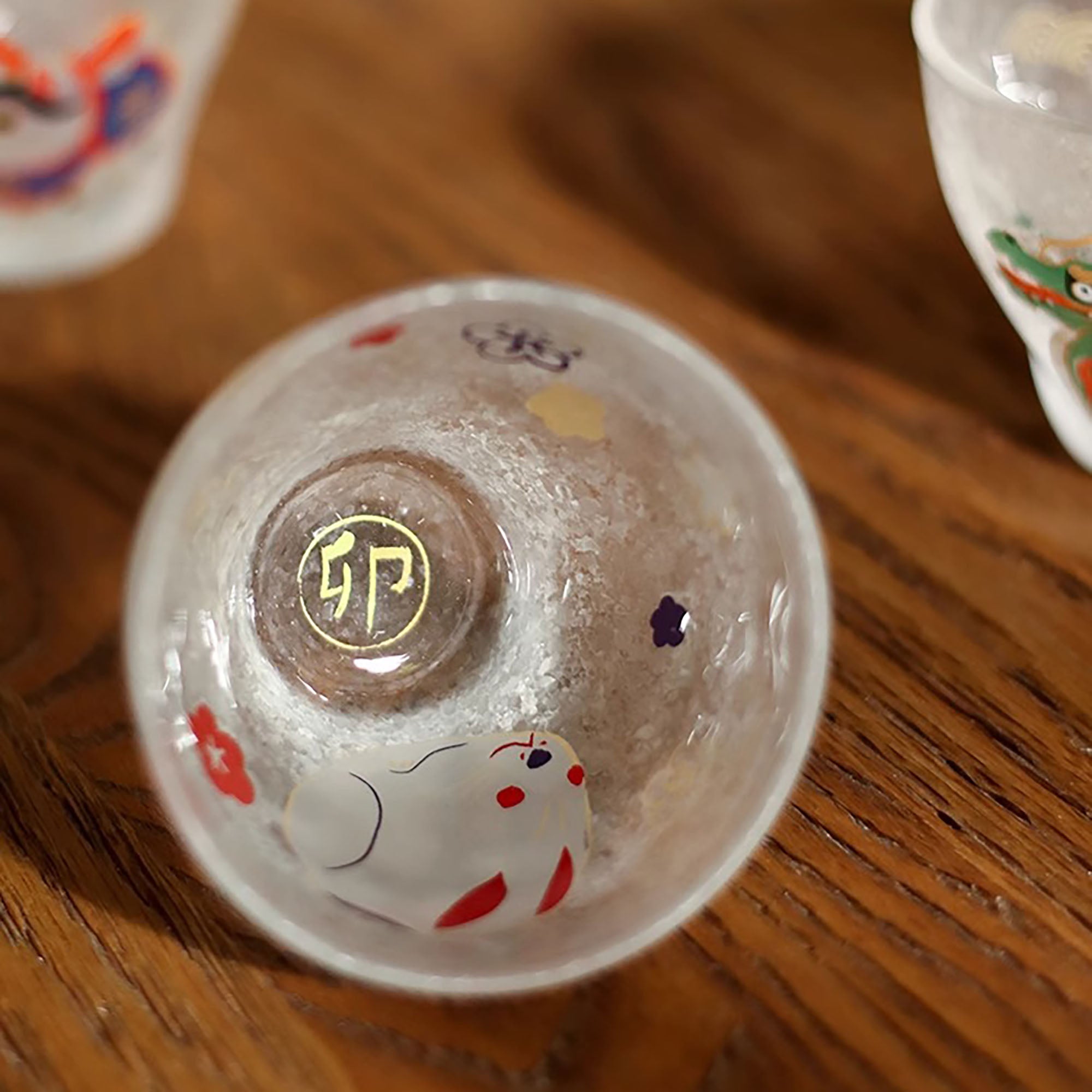 Ce verre à saké japonais produit par Aderia (Ishizuka Glass) incarne l’élégance intemporelle de l’art verrier japonais.Sa texture givrée délicate et lisse, ornée de motifs de flocons de neige, est sublimée par les designs adorables des 12 signes du zodiaque chinois et des porte-bonheur traditionnels japonais.